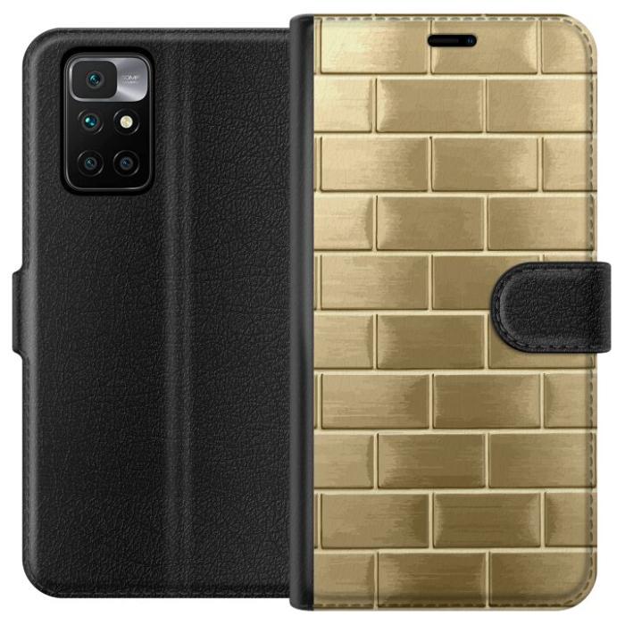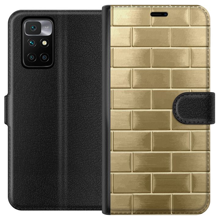 Plånboksfodral för Redmi 10 med Gyllene Murstenar -design. Fodralet kombinerar stil och funktion – ett slitstarkt mobilskal som skyddar mot repor och stötar samt praktiska kortfack på insidan.