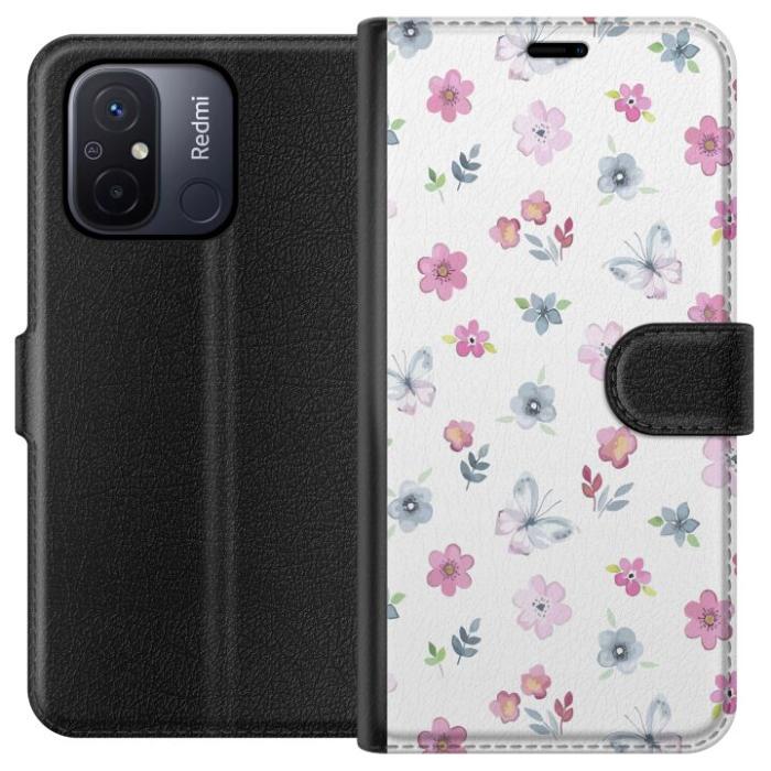 Plånboksfodral för Redmi 12C med Blommor och fjärillar -design. Fodralet kombinerar stil och funktion – ett slitstarkt mobilskal som skyddar mot repor och stötar samt praktiska kortfack på insidan.