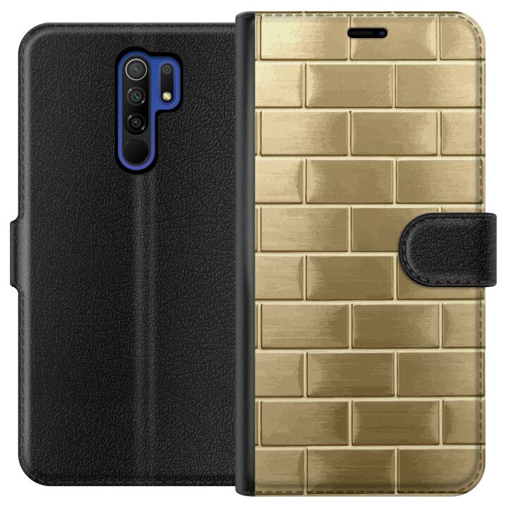 Plånboksfodral för Redmi 9 med Gyllene Murstenar -design. Fodralet kombinerar stil och funktion – ett slitstarkt mobilskal som skyddar mot repor och stötar samt praktiska kortfack på insidan.