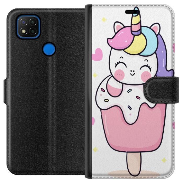 Plånboksfodral för Redmi 9C med Glad enhörning -design. Fodralet kombinerar stil och funktion – ett slitstarkt mobilskal som skyddar mot repor och stötar samt praktiska kortfack på insidan.