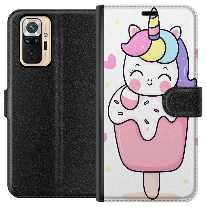 Plånboksfodral för Redmi Note 10 Pro med Glad enhörning -design. Fodralet kombinerar stil och funktion – ett slitstarkt mobilskal som skyddar mot repor och stötar samt praktiska kortfack på insidan.