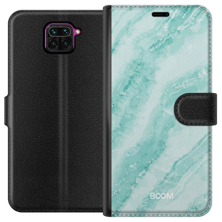 Plånboksfodral för Redmi Note 9 med Mint Marble -design. Fodralet kombinerar stil och funktion – ett slitstarkt mobilskal som skyddar mot repor och stötar samt praktiska kortfack på insidan.