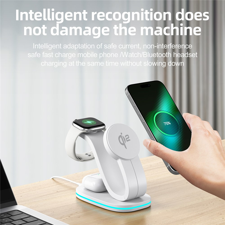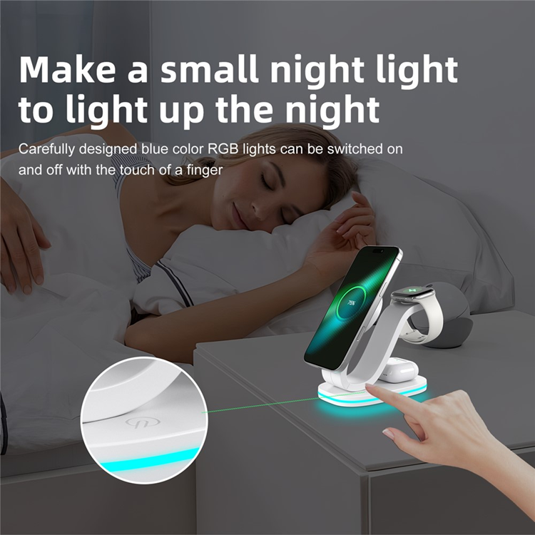 Säg hejdå till kabeltrassel och överfulla eluttag. B-28 Multifunktionell 15W Trådlös Laddare med Nattlampa ger dig en allt-i-ett-lösning för att ladda din mobil, smartklocka och hörlurar – samtidigt. Den kompakta och moderna designen smälter in i alla miljöer, från nattduksbordet till kontoret, medan den inbyggda nattlampan skapar en behaglig stämning i rummet utan att störa din sömn.