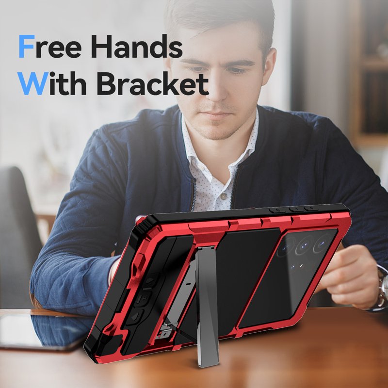 Skydda din Galaxy S24 Ultra med R-JUSTs shockproof skal i röd färg. Detta skal är designat för att motstå stötar och fall, vilket ger ett pålitligt skydd för din telefon. Med extra funktioner som en kickstand och skärmskydd, är detta skal både praktiskt och hållbart.