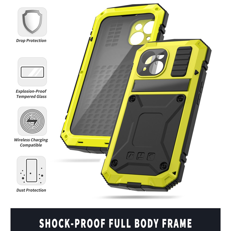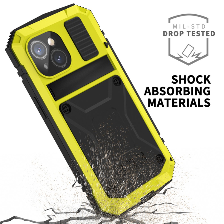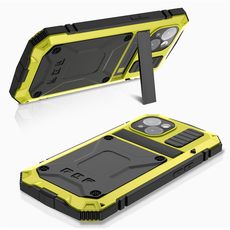 R-JUST iPhone 15 Mobilskal med Härdat Glas Kickstand PC + Silikon + Metall - Gul