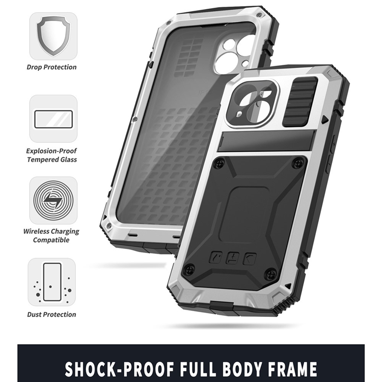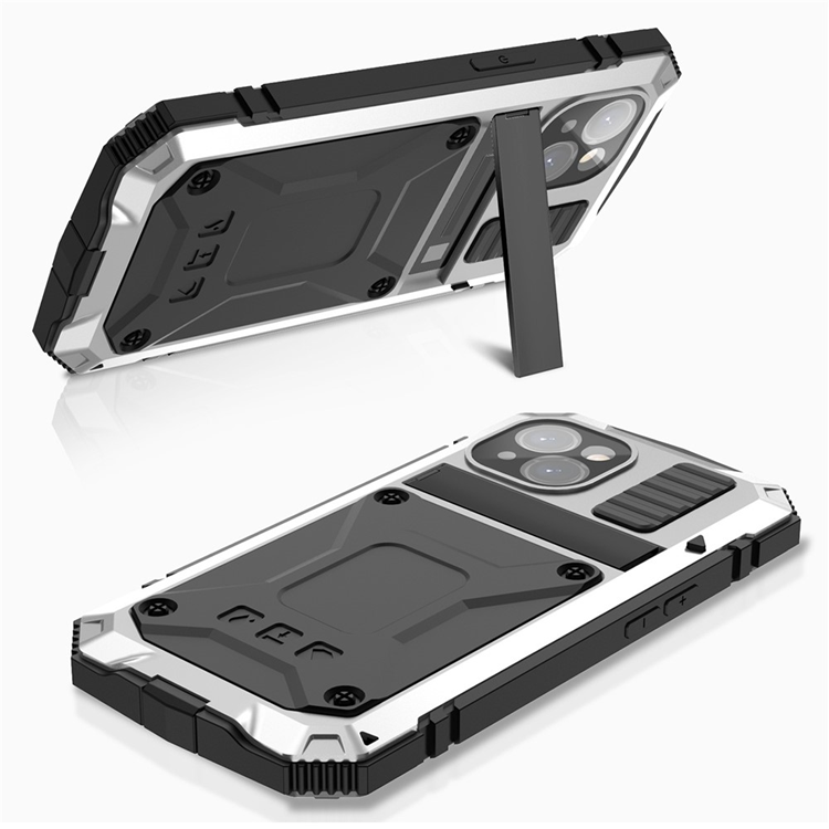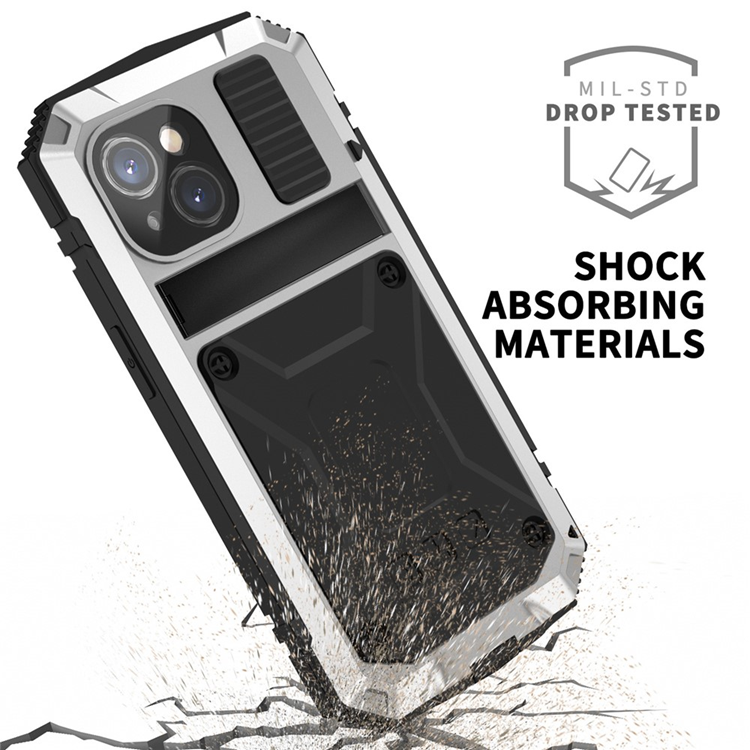 R-JUST iPhone 15 Mobilskal med Härdat Glas Kickstand PC + Silikon + Metall - Silver