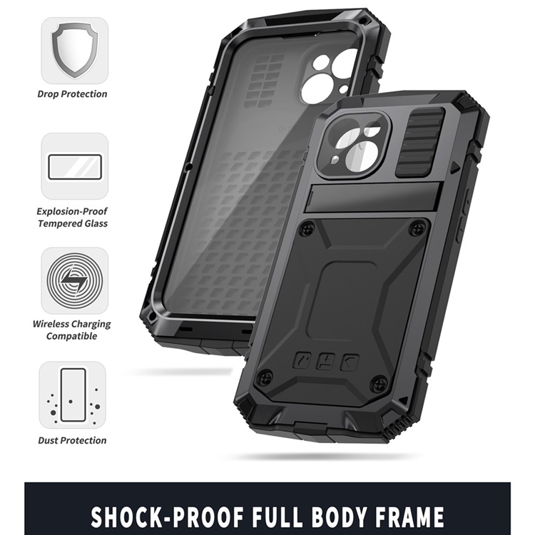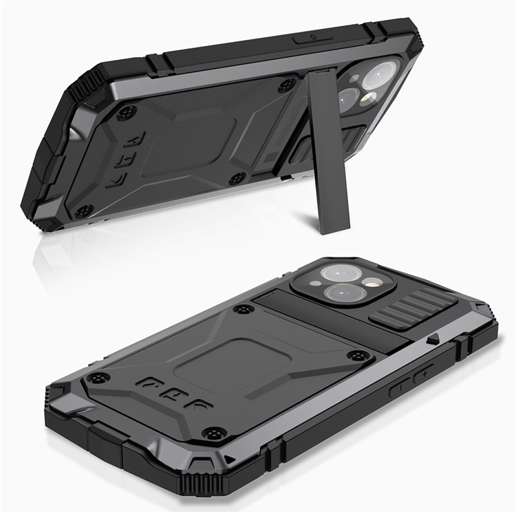 R-JUST iPhone 15 Mobilskal med Härdat Glas Kickstand PC + Silikon + Metall - Svart
