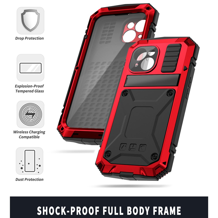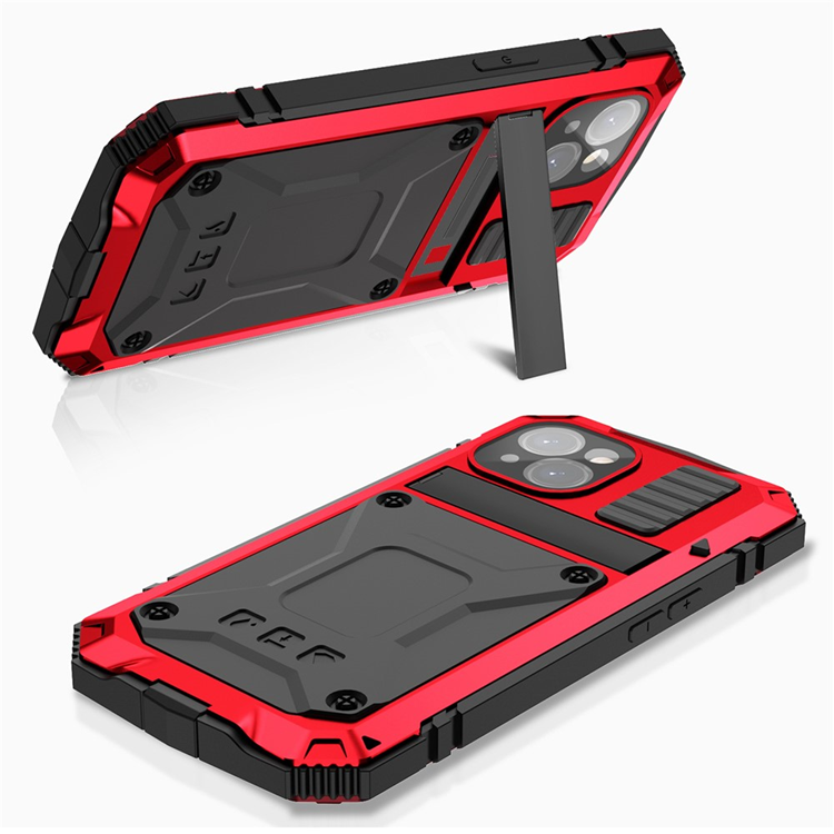 R-JUST iPhone 15 Plus Mobilskal med Härdat Glas Kickstand PC + Silikon + Metall - Röd