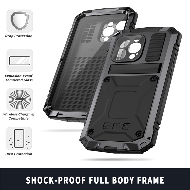 R-JUST iPhone 15 Pro Max Mobilskal med Härdat Glas Kickstand PC + Silikon + Metall - Svart