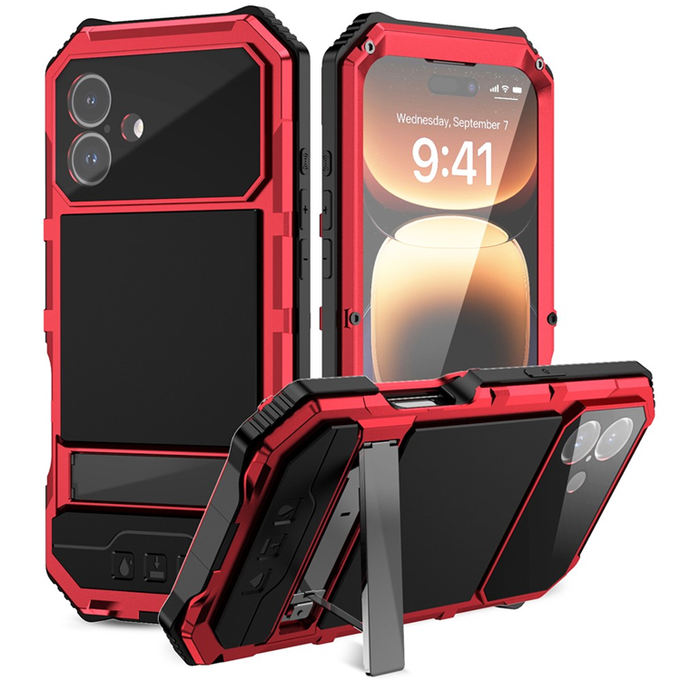 R-JUST iPhone 16 Plus Mobilskal med Härdat Glas Kickstand PC + Silikon + Metall - Röd