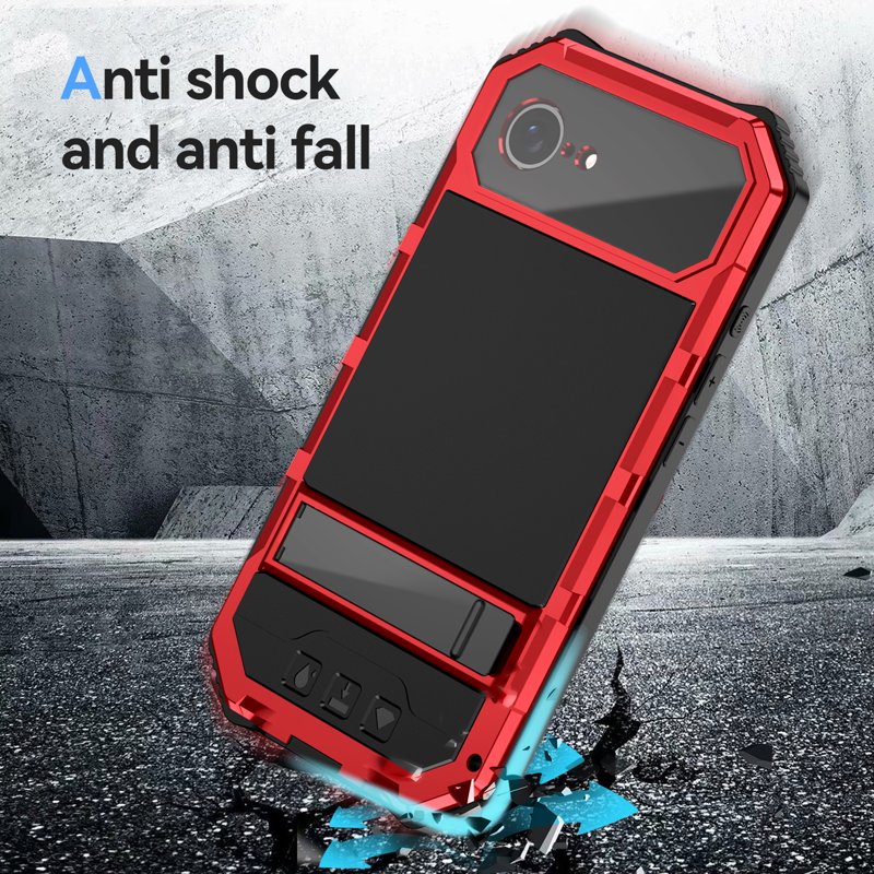 R-JUST iPhone 16e Skal PC + Silikon + Metall Ställ - Röd