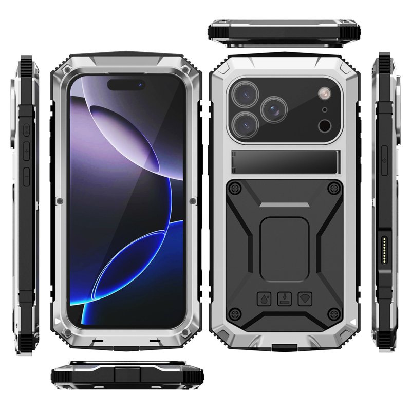 R-JUST iPhone 17 Pro Skal PC + Silikon + Metall Ställ - Silver
