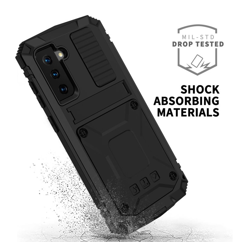 Skydda din Galaxy S21 med R-JUST Kickstand TPU+Metal skyddsfodral. Detta fodral kombinerar stil och funktionalitet. Det erbjuder överlägset skydd mot stötar, vatten och damm. Med en inbyggd kickstand kan du enkelt njuta av handsfree-visning.