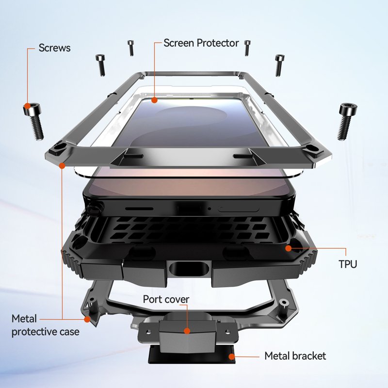 Material: PC, silicone, tempered glass, metal