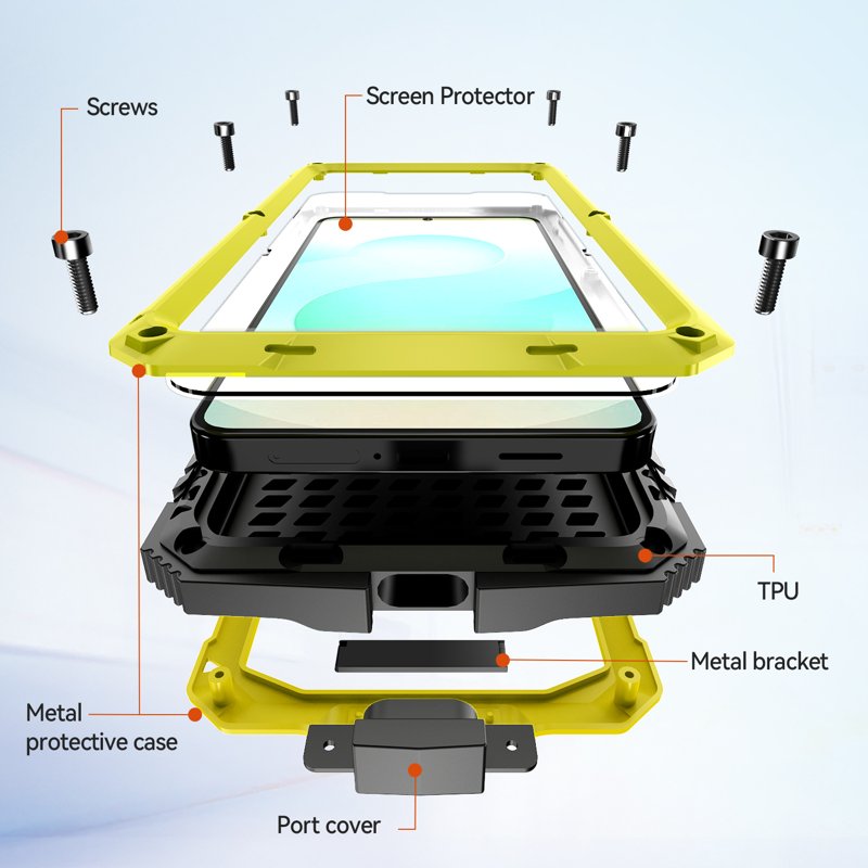 Material: PC, silicone, tempered glass, metal