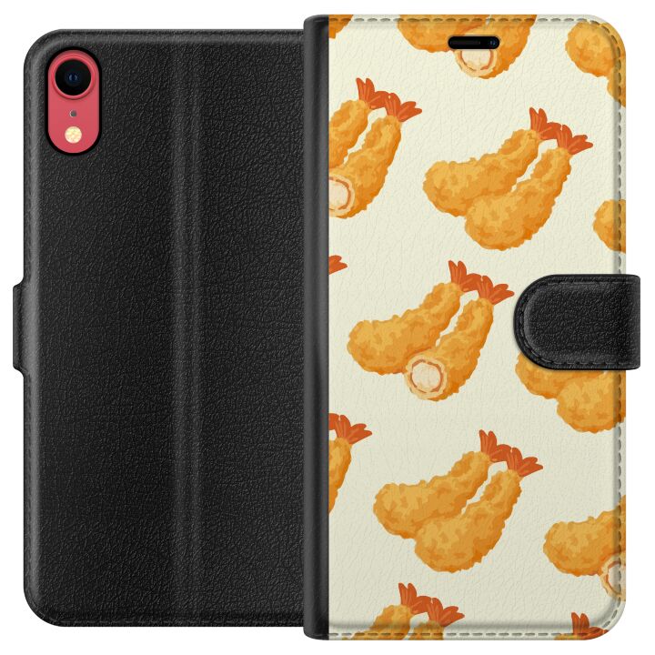 Plånboksfodral för iPhone XR med Räkor -design. Fodralet kombinerar stil och funktion – ett slitstarkt mobilskal som skyddar mot repor och stötar samt praktiska kortfack på insidan.