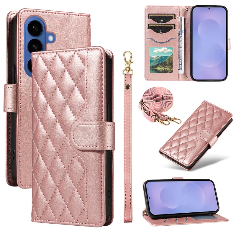 Samsung Galaxy S26+ Wallet Case Rhombus Leather Phone Cover med rem är den perfekta lösningen för att skydda din telefon samtidigt som du har stil. Med en elegant design och praktiska funktioner är detta fodral både funktionellt och snyggt. Det erbjuder omfattande skydd och möjligheten att bära med dig dina viktigaste kort och kontanter.