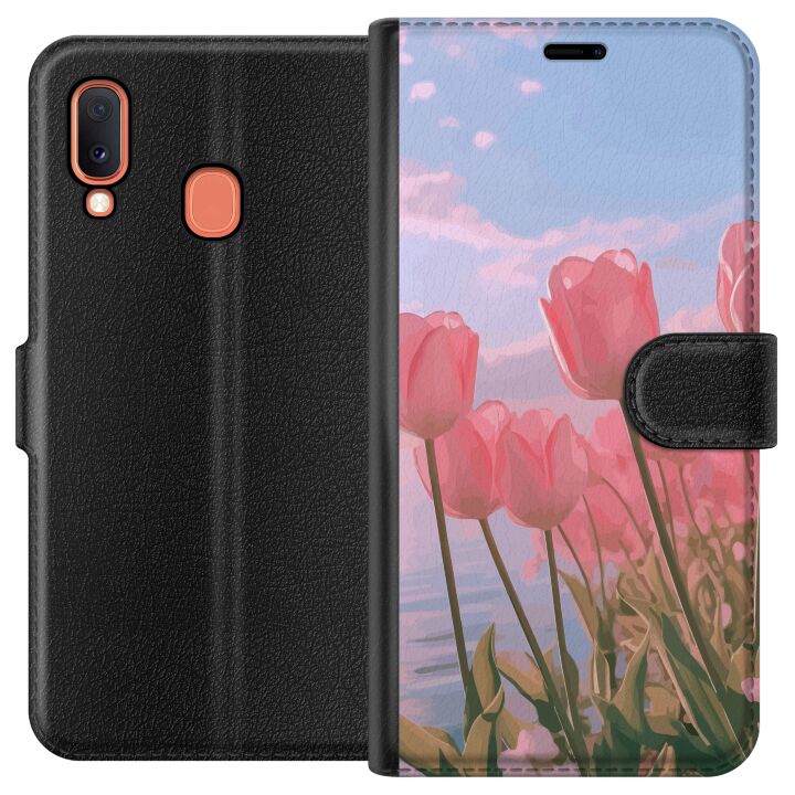 Plånboksfodral för Galaxy A20e med Rosa Tulpaner -design. Fodralet kombinerar stil och funktion – ett slitstarkt mobilskal som skyddar mot repor och stötar samt praktiska kortfack på insidan.