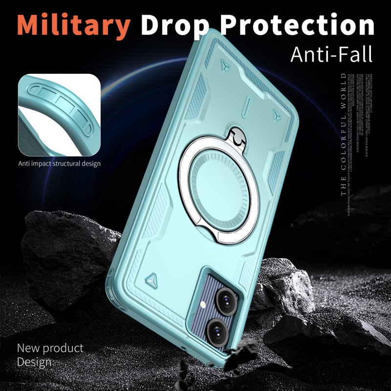 Denna telefonfodral erbjuder överlägset skydd med en hållbar kombination av PC och TPU-material. Den är stöttålig och motståndskraftig mot fall, vilket gör att din enhet förblir säker under tuffa förhållanden. Med en inbyggd kickstand och MagSafe-kompatibilitet är detta fodral både praktiskt och funktionellt.