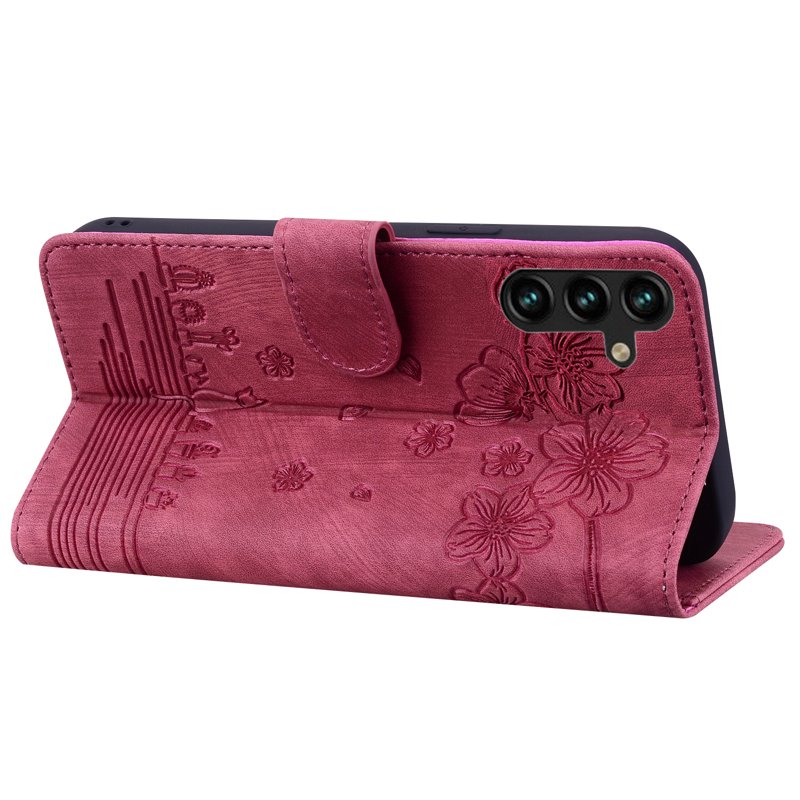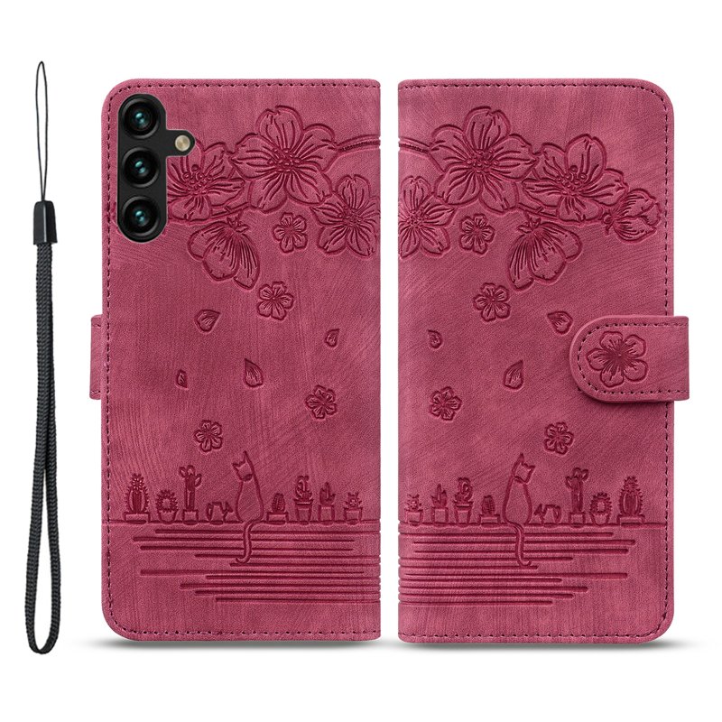 Skydda din Samsung Galaxy A35 5G med detta eleganta och funktionella mobilskal. Det vinröda skalet med blommotiv och kattdesign ger en unik stil. Med praktiska funktioner som kortfack och ställfunktion är detta skal både vackert och användbart.