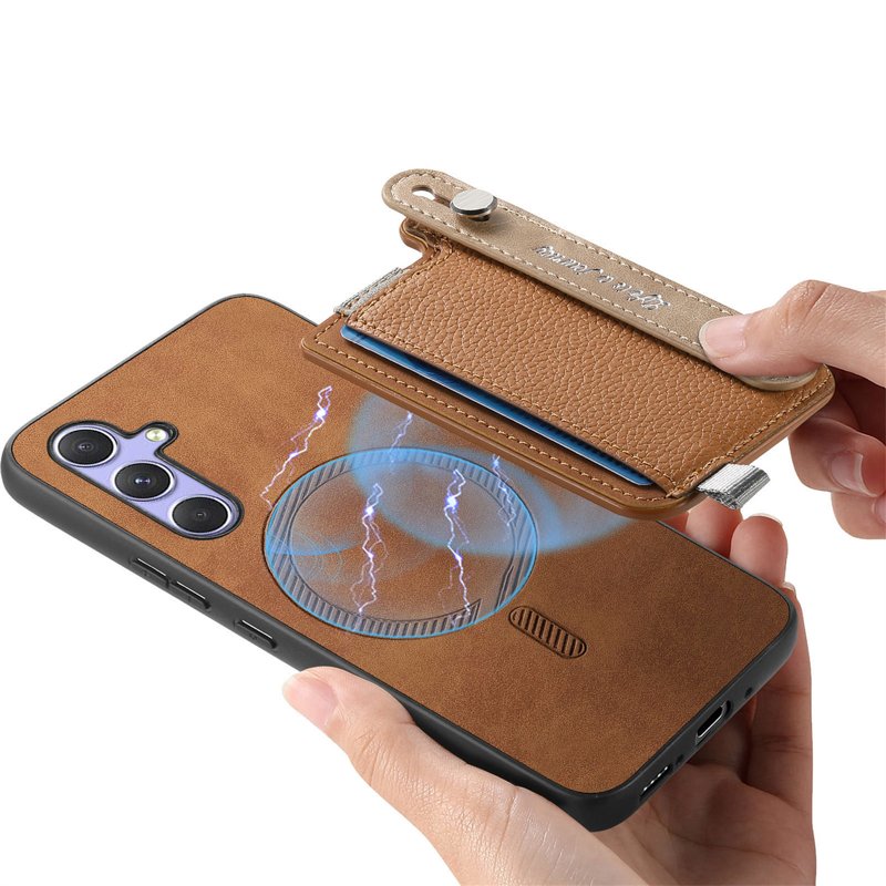 Skydda din Samsung Galaxy A35 5G med det magnetiska läderfodralet. Detta fodral kombinerar stil och funktionalitet. Med en avtagbar korthållare och handrem erbjuder det både säkerhet och bekvämlighet. Håll din telefon säker och dina kort nära till hands.