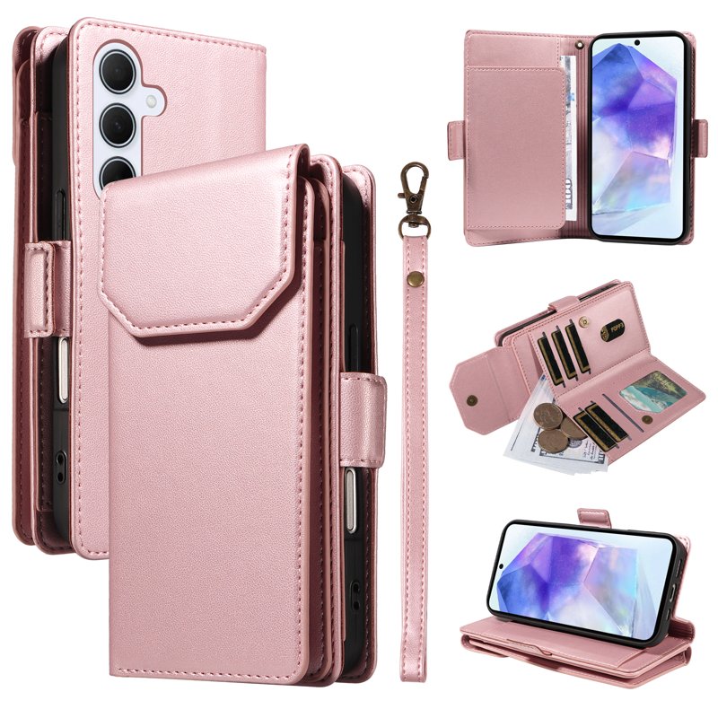 Skydda din Samsung Galaxy A55 5G med detta eleganta och funktionella fodral i roséguld. Fodralet är tillverkat av högkvalitativt PU-läder och matte TPU, vilket ger både stil och hållbarhet. Med flera kortfack och en avtagbar handledsrem är detta fodral perfekt för den moderna användaren som vill ha allt samlat på ett ställe.