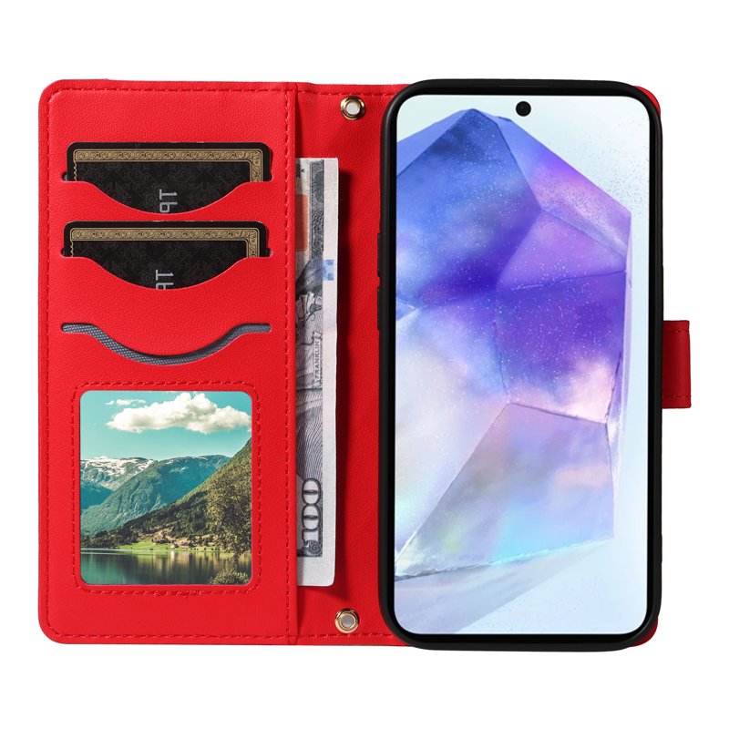 Skydda din Samsung Galaxy A55 5G med det stiliga och funktionella Wallet Rhombus Leather Phone Cover. Detta fodral kombinerar elegans med praktiska funktioner. Med en axelrem och handledsrem är det enkelt att bära med sig. Fodralet erbjuder även plats för kort och kontanter, vilket gör det till det perfekta valet för den moderna användaren.