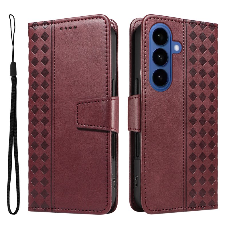 Skydda din Samsung Galaxy S26 eller S26 Pro med detta eleganta läderfodral i vinröd färg. Fodralet har en stilren design med rutmönster och erbjuder både funktionalitet och skydd. Med inbyggda kortfack och en praktisk ställfunktion är detta fodral perfekt för den moderna användaren.