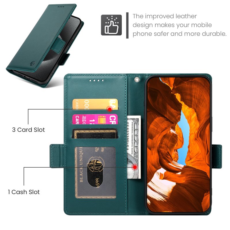- Säkra magnetiska sidoklämmor - Magnetiska klämmor ger säker och bekväm åtkomst till din telefon och dina kort, så att allt hålls på plats.