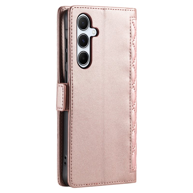 Skydda din Samsung Galaxy S26+ med detta eleganta läderfodral i roséguld. Fodralet har en stilren rhombus-textur och erbjuder både funktionalitet och skydd. Med smarta kortfack och en praktisk handledsrem är detta fodral perfekt för den som vill ha sina viktigaste tillhörigheter nära till hands.