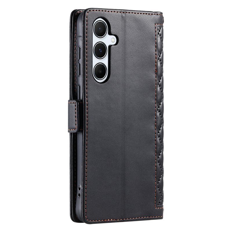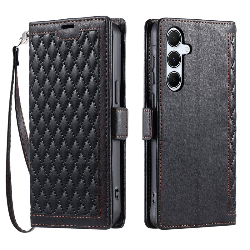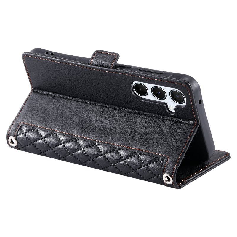 Skydda din Samsung Galaxy S26+ med detta eleganta läderfodral i rhombus-textur. Fodralet kombinerar stil och funktionalitet, vilket gör det till det perfekta valet för den moderna användaren. Med flera kortfack och en praktisk handledsrem, håller du dina viktigaste tillhörigheter organiserade och nära till hands.
