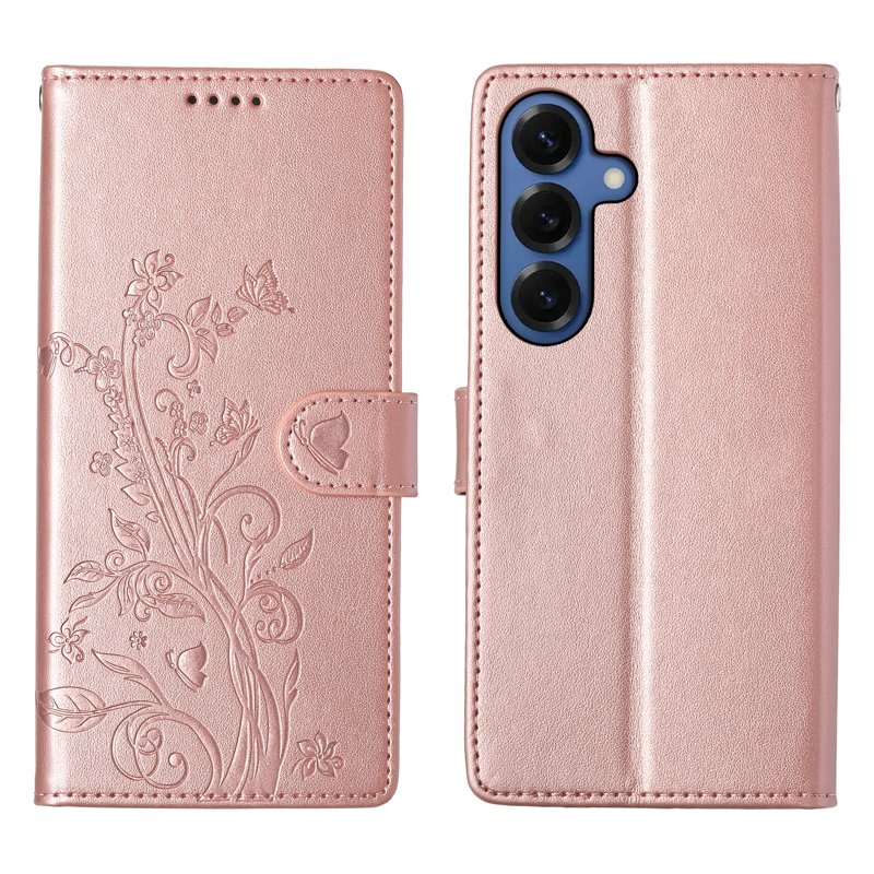Skydda din Samsung Galaxy S26+ med denna stiliga Wallet Case i PU-läder. Med en vacker fjärilsblomma präglad design i roséguld, erbjuder detta fodral både elegans och funktionalitet. Det är perfekt för den som vill ha en kombination av mode och skydd.