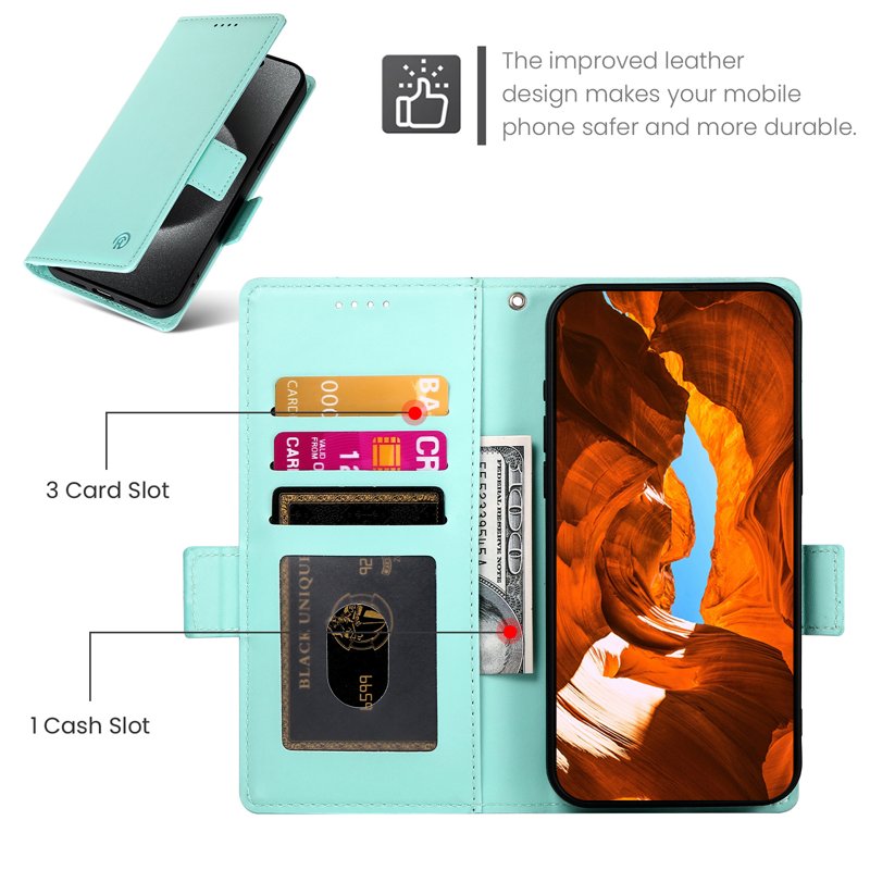 Upptäck Samsung Galaxy S26+ Stand Case i PU-läder. Denna mintgröna plånboksfodral kombinerar stil och funktionalitet. Med hållbara material och smart design är den perfekt för dig som vill skydda din telefon samtidigt som du har allt du behöver nära till hands.