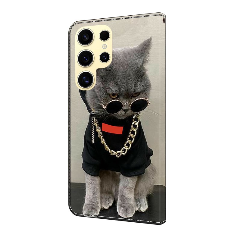 Skydda din Samsung Galaxy S26 Ultra med detta läckra läderfodral. Med ett unikt mönster av en katt med glasögon och halsband, kombinerar detta fodral stil och funktionalitet. Det är perfekt för den som vill ha ett skydd som också är en modeaccessoar.