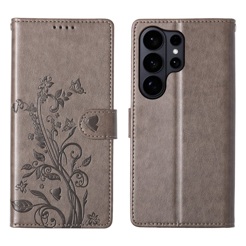 Skydda din Samsung Galaxy S26 Ultra med vår stiliga Wallet Case i PU-läder. Denna grå telefonfodral kombinerar funktionalitet med elegans. Med en vacker präglad fjärilsblomsterdesign och praktiska funktioner är detta fodral perfekt för den moderna användaren.