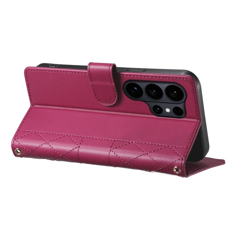 Skydda din Samsung Galaxy S26 Ultra med detta eleganta Wallet Case i röd färg. Tillverkat av PU-läder och med en stilren rhombus-stygndesign, erbjuder det både funktionalitet och stil. Med flera kortfack och en praktisk ståfunktion är detta fodral perfekt för den moderna användaren.