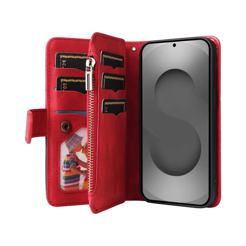 Skydda din Samsung Galaxy S26 Ultra med detta eleganta läderfodral. Fodralet har en praktisk dragkedja och plats för upp till nio kort. Den stiliga designen och det hållbara materialet gör det till ett utmärkt val för både skydd och stil. Njut av bekvämligheten av ett justerbart stativ för handsfree-användning.