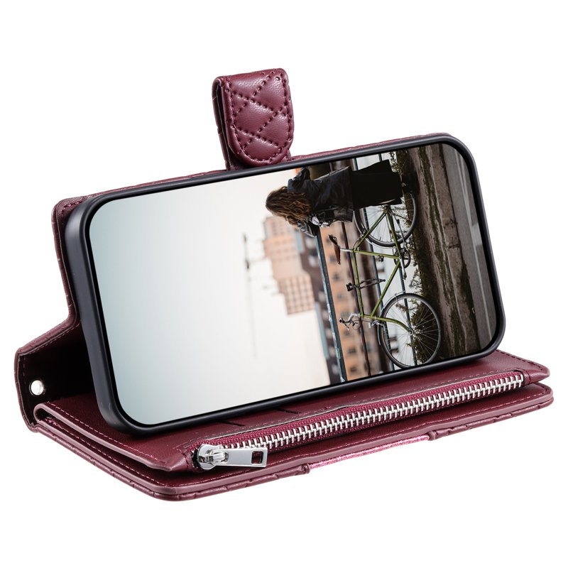 Skydda din Samsung Galaxy S26 Ultra med detta stiliga och funktionella fodral i vinröd färg. Fodralet är tillverkat av högkvalitativt PU-läder och har en praktisk dragkedjeficka. Med sin unika rhombusdesign och glittrande detaljer ger det en elegant touch. Perfekt för den som vill ha både stil och funktionalitet i ett och samma fodral.
