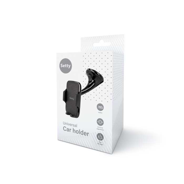 Universal bilhållare för smartphones och navigation. Beständig och lätt att använda. Stark sugkopp gör att du kan fästa produkten stabilt på glaset och kan roteras 360 grader för att säkerställa njutning av enheten när du reser.