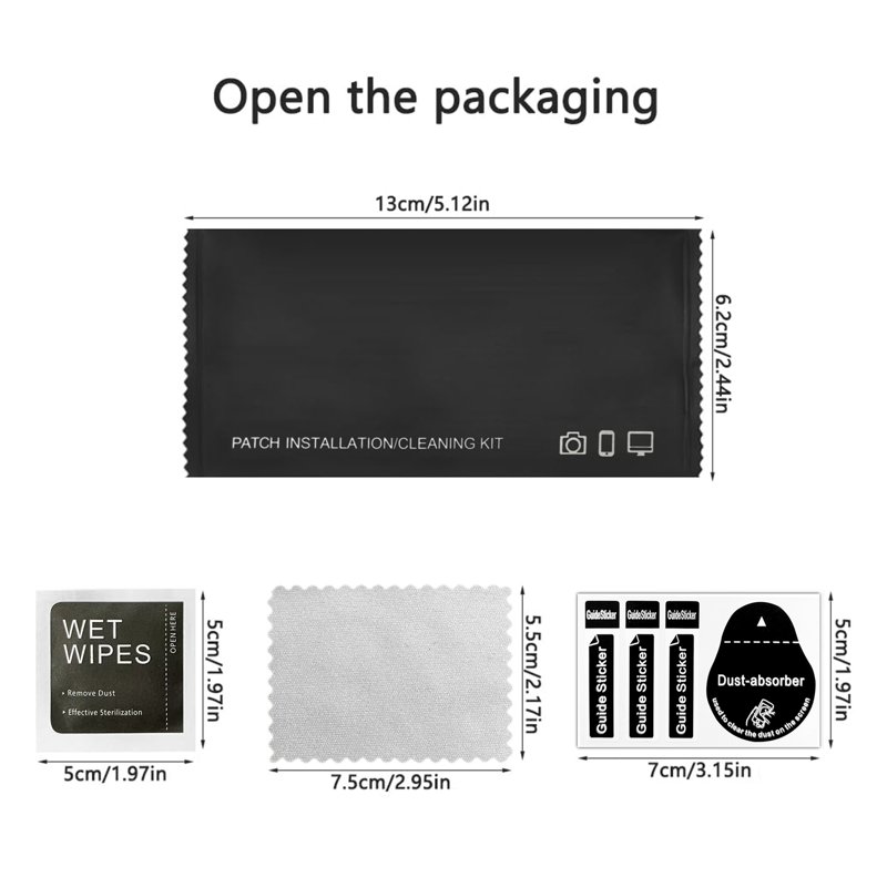 Paketinnehåll: 10 x Tempered Glass Screen Protector, 10 x Wipes Set, 10 x Dust-absorber, 10 x Patch Installation / Cleaning Kit, 10 x Microfiber Cloth