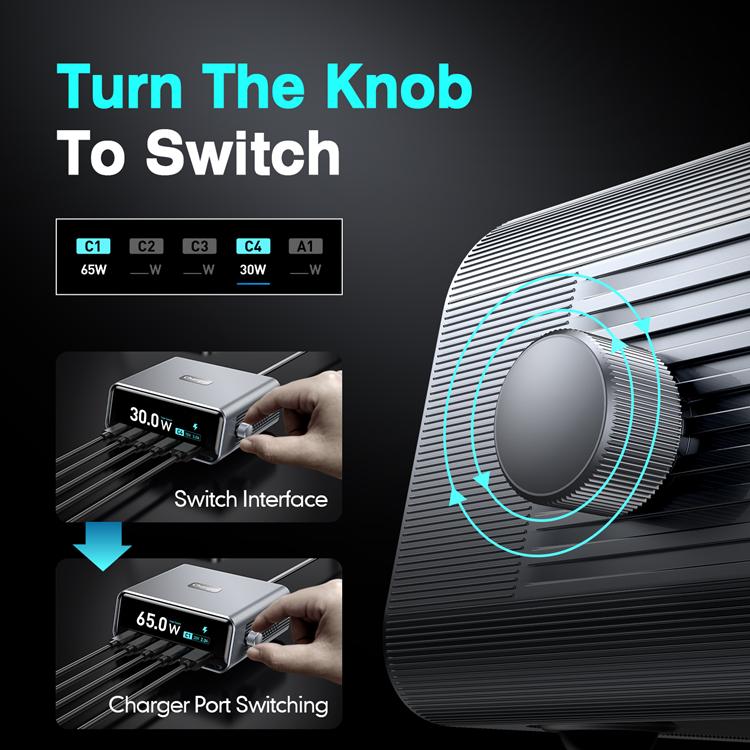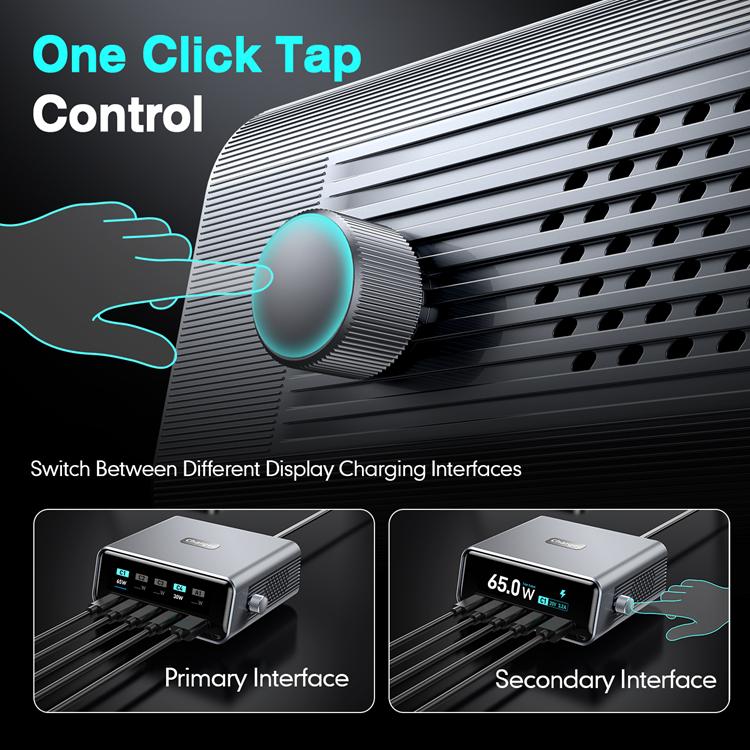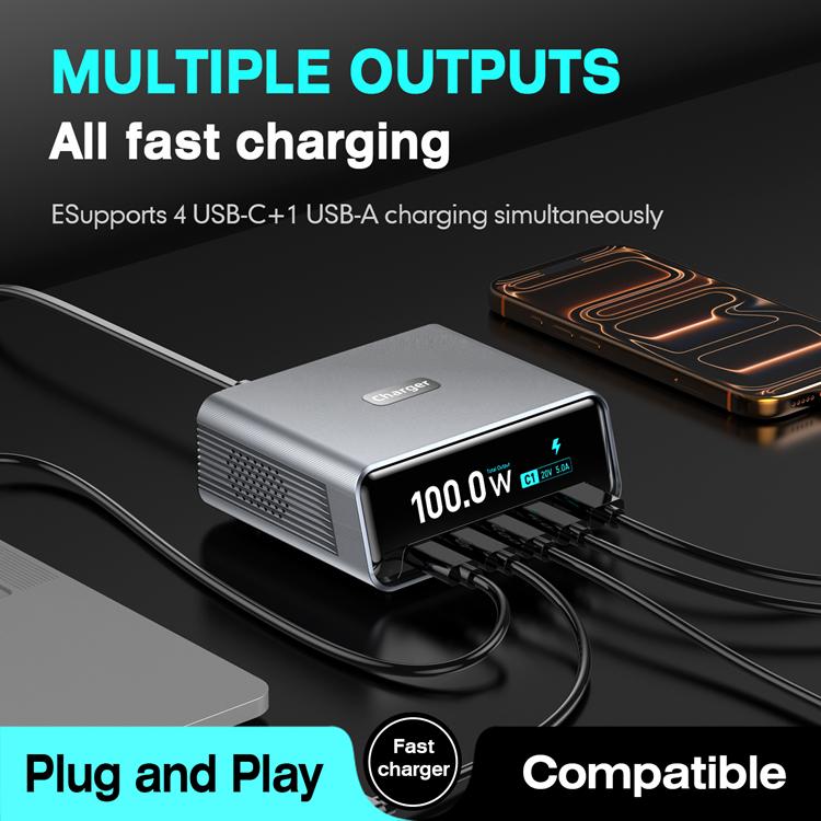 WLX-60D är en kraftfull och intelligent GaN-baserad laddstation för skrivbordet, utvecklad för användare med höga krav på prestanda, kontroll och säkerhet. Med upp till 265W total uteffekt kan du ladda upp till fem enheter samtidigt – bärbara datorer, surfplattor, smartphones och tillbehör – från en enda, kompakt station.