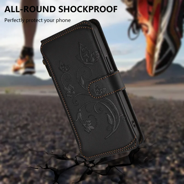 Sony Xperia 10 VII Plånboksfodral Butterfly Floral Imprint Zipper med Handledsrem - Svart