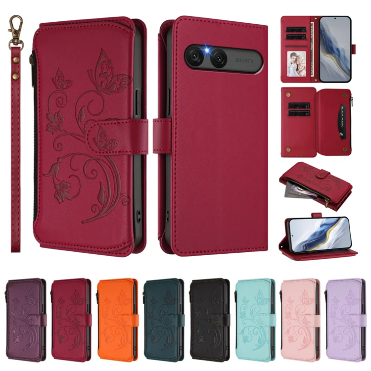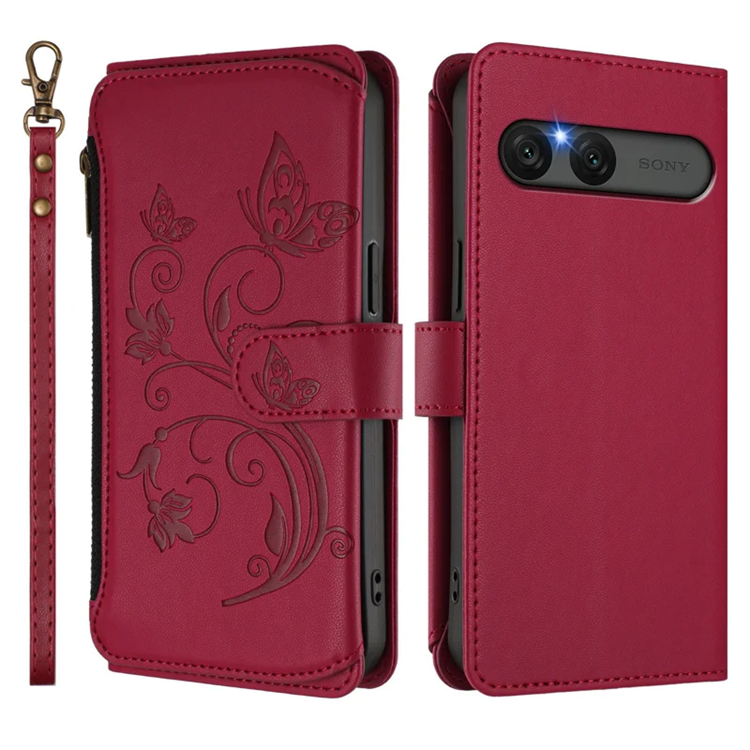 Sony Xperia 10 VII Plånboksfodral Butterfly Floral Imprint Zipper med Handledsrem - Vinröd
