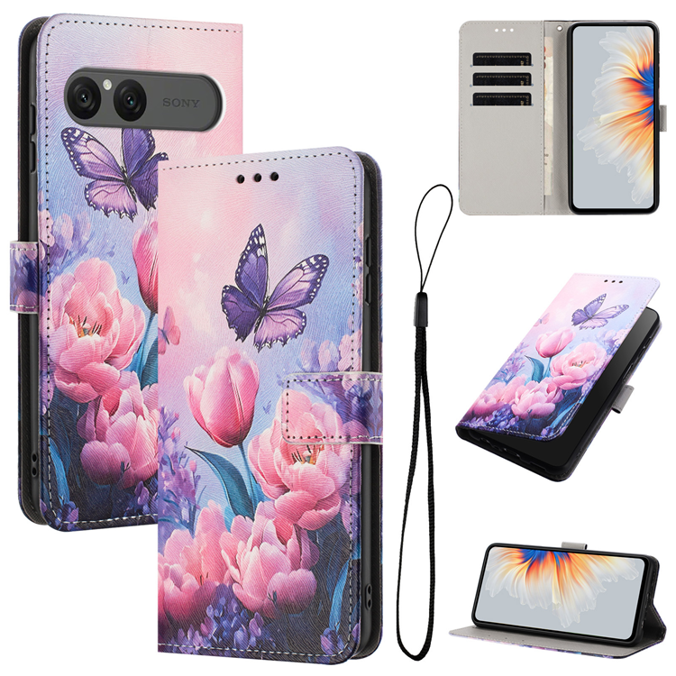 Sony Xperia 10 VII Plånboksfodral Pattern Printing Läder Med Landyard - Rosa Flower Butterfly