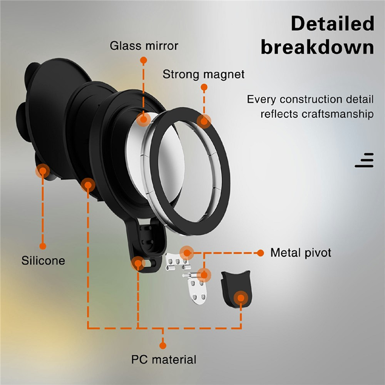 Robust konstruktion: Tillverkad av PC, silikon, spegelglas och magneter för hållbarhet och användarvänlighet.