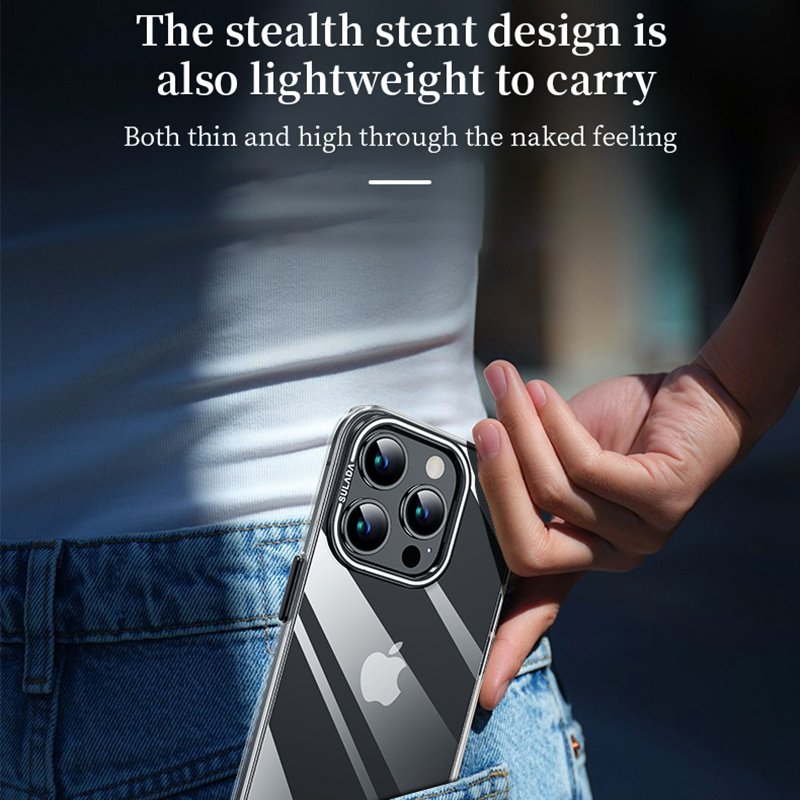 Skydda din iPhone 15 Pro Max med SULADA:s eleganta och funktionella skal. Tillverkat av hållbart TPU och PC-material, erbjuder detta skal både stil och säkerhet. Den transparenta baksidan visar telefonens skönhet, medan det vikbara linsramen fungerar som ett stativ för bekväm visning.