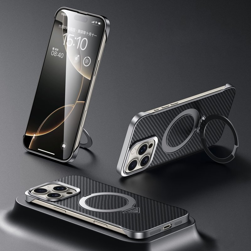Detta skal är designat för iPhone 15 Pro och kombinerar stil med funktionalitet. Med MagSafe-kompatibilitet och en justerbar kickstand erbjuder det både skydd och bekvämlighet. Den eleganta kolfibertexturen ger en modern look och ett bra grepp.