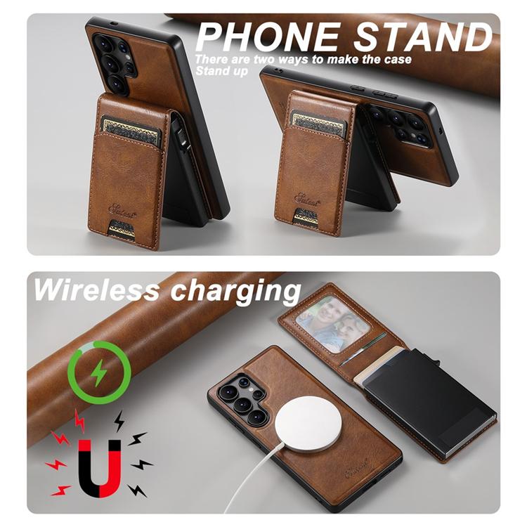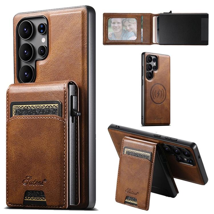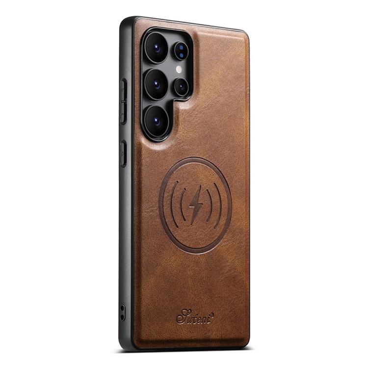 Suteni Mobilskal för Galaxy S25 Ultra MagSafe Korthållare Waxy Texture Läder H19 - Brun