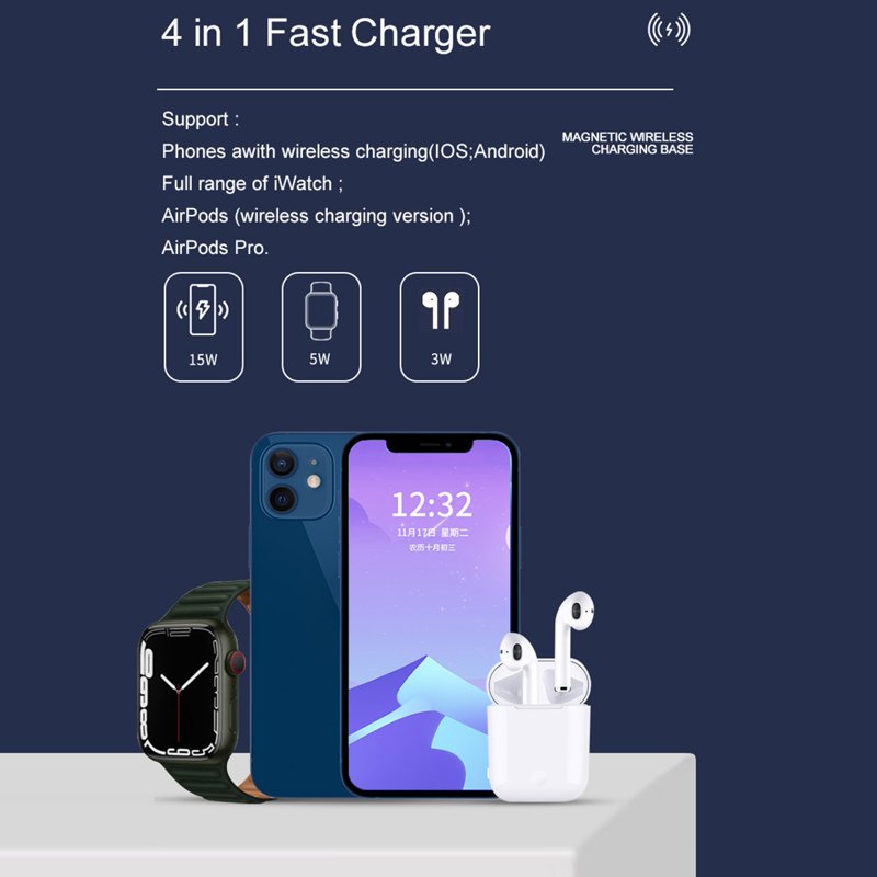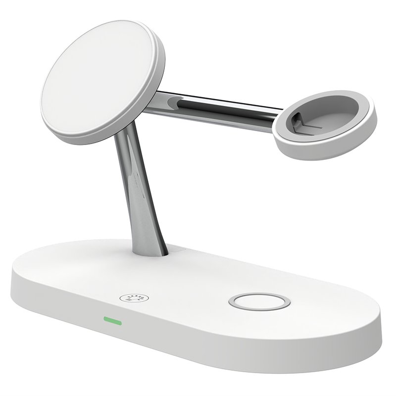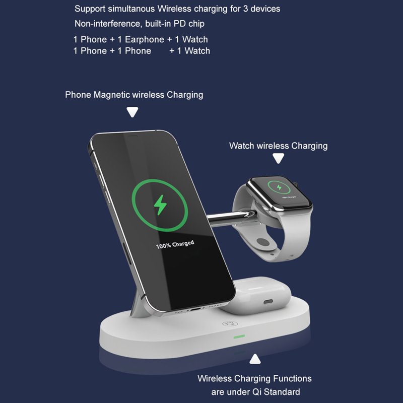 Denna trådlösa laddare erbjuder snabb och effektiv laddning för upp till tre enheter samtidigt. Med stöd för PD och QC 3.0, samt en dedikerad ställning för Apple Watch, är den perfekt för den moderna användaren. Justerbar nattlampa och LED-indikatorer gör den både praktisk och användarvänlig.