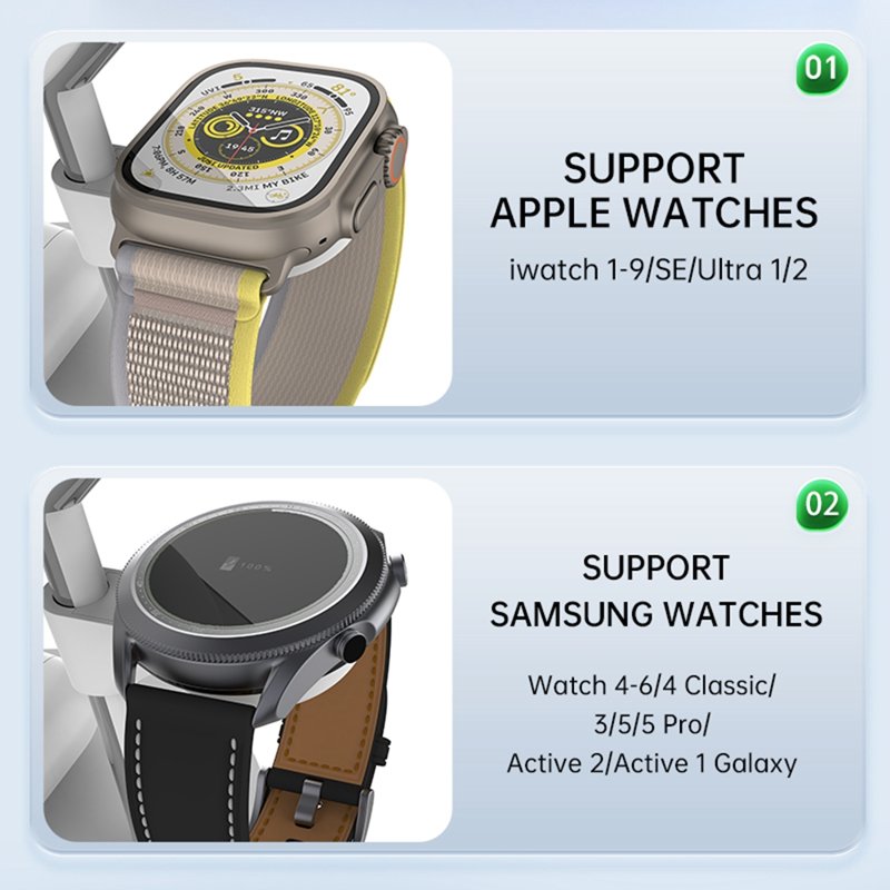 • Universell Klockkompatibilitet: Laddar både Apple Watch och Samsung Galaxy Watch, vilket gör den mångsidig för olika användare.